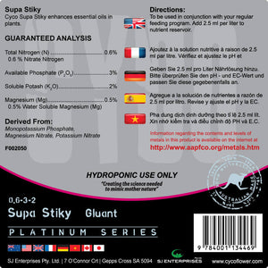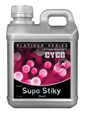 CYCO Platinum Series Supa Stiky is an additive that is used during the flowering cycle of plant growth and aids in the construction of components crucial to the formation of the essential oil compounds in the plant. Supa Stiky is a source of magnesium, which is required to catalyze many enzymatic reactions within the plant. This process encourages the production of the plants essential oils as well as enhanced aroma, yield, and quality of the end product. Supa Stiky is also a source of Potassium and Phosphorus, both key minerals used in fruit formation, while Potassium is need to catalyze many enzymatic growth reactions inside the plant.